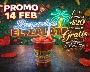 En la compra de $20 o 2 raspados medianos, se regala un raspado de fresa de 12 oz.